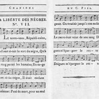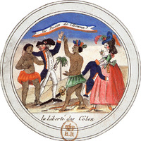 - Les objets commémoratifs de la première abolition de l'esclavage sous la Révolution française (en février 1794) sont assez rares. Cet éventail fait donc relativement exception. Il juxtapose deux chansons et une estampe coloriée, célébrant l'émancipation des anciens esclaves. L'objet d'actualité, produit au moment du décret d'abolition, est devenu trace mémorielle d'une liberté chèrement acquise.