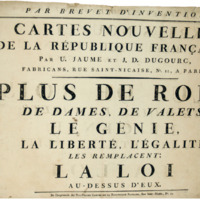 Comme l'illustre l'enseigne peinte, titrée « Au nom de la loi » et se concluant par la précision « on tient le tabac râpé », les registres politiques et commerciaux sont de plus en plus interconnectés au cours de la décennie révolutionnaire. Une publicité affichée pour des cartes à jouer, conçue à partir de février 1793 par le dessinateur Jean-Démosthène Dugourc et le négociant Urbain Jaume, associe ainsi l'annonce de vente et les nouveaux principes révolutionnaires : « Plus de rois, de dames, de valets ; le génie, la liberté, l'égalité les remplacent : la Loi au-dessus d'eux ».